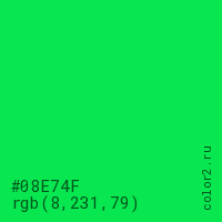 Цвет #08E74F в цветовой модели RGB обозначается тремя октетами (8, 231, 79) в десятичном формате и #08E74F в шестнадцатиричном (hex) формате, которые являются интенсивностью красного 8 (hex 08), интенсивность зелёного 231 (hex E7) и интенсивность синего 79 (hex 4F).