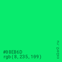 Цвет #08EB6D в цветовой модели RGB обозначается тремя октетами (8, 235, 109) в десятичном формате и #08EB6D в шестнадцатиричном (hex) формате, которые являются интенсивностью красного 8 (hex 08), интенсивность зелёного 235 (hex EB) и интенсивность синего 109 (hex 6D).