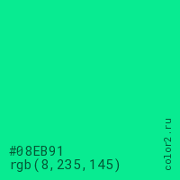 Цвет #08EB91 в цветовой модели RGB обозначается тремя октетами (8, 235, 145) в десятичном формате и #08EB91 в шестнадцатиричном (hex) формате, которые являются интенсивностью красного 8 (hex 08), интенсивность зелёного 235 (hex EB) и интенсивность синего 145 (hex 91).