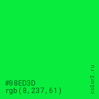 Цвет #08ED3D в цветовой модели RGB обозначается тремя октетами (8, 237, 61) в десятичном формате и #08ED3D в шестнадцатиричном (hex) формате, которые являются интенсивностью красного 8 (hex 08), интенсивность зелёного 237 (hex ED) и интенсивность синего 61 (hex 3D).