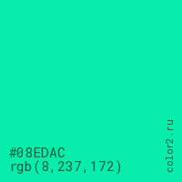 Цвет #08EDAC в цветовой модели RGB обозначается тремя октетами (8, 237, 172) в десятичном формате и #08EDAC в шестнадцатиричном (hex) формате, которые являются интенсивностью красного 8 (hex 08), интенсивность зелёного 237 (hex ED) и интенсивность синего 172 (hex AC).