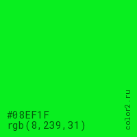 Цвет #08EF1F в цветовой модели RGB обозначается тремя октетами (8, 239, 31) в десятичном формате и #08EF1F в шестнадцатиричном (hex) формате, которые являются интенсивностью красного 8 (hex 08), интенсивность зелёного 239 (hex EF) и интенсивность синего 31 (hex 1F).