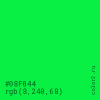Цвет #08F044 в цветовой модели RGB обозначается тремя октетами (8, 240, 68) в десятичном формате и #08F044 в шестнадцатиричном (hex) формате, которые являются интенсивностью красного 8 (hex 08), интенсивность зелёного 240 (hex F0) и интенсивность синего 68 (hex 44).