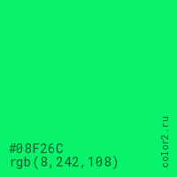 Цвет #08F26C в цветовой модели RGB обозначается тремя октетами (8, 242, 108) в десятичном формате и #08F26C в шестнадцатиричном (hex) формате, которые являются интенсивностью красного 8 (hex 08), интенсивность зелёного 242 (hex F2) и интенсивность синего 108 (hex 6C).