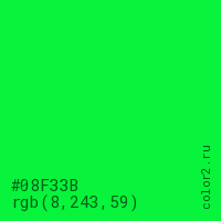 Цвет #08F33B в цветовой модели RGB обозначается тремя октетами (8, 243, 59) в десятичном формате и #08F33B в шестнадцатиричном (hex) формате, которые являются интенсивностью красного 8 (hex 08), интенсивность зелёного 243 (hex F3) и интенсивность синего 59 (hex 3B).