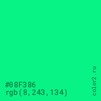 Цвет #08F386 в цветовой модели RGB обозначается тремя октетами (8, 243, 134) в десятичном формате и #08F386 в шестнадцатиричном (hex) формате, которые являются интенсивностью красного 8 (hex 08), интенсивность зелёного 243 (hex F3) и интенсивность синего 134 (hex 86).