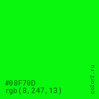 Цвет #08F70D в цветовой модели RGB обозначается тремя октетами (8, 247, 13) в десятичном формате и #08F70D в шестнадцатиричном (hex) формате, которые являются интенсивностью красного 8 (hex 08), интенсивность зелёного 247 (hex F7) и интенсивность синего 13 (hex 0D).