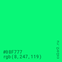 Цвет #08F777 в цветовой модели RGB обозначается тремя октетами (8, 247, 119) в десятичном формате и #08F777 в шестнадцатиричном (hex) формате, которые являются интенсивностью красного 8 (hex 08), интенсивность зелёного 247 (hex F7) и интенсивность синего 119 (hex 77).