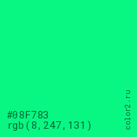 Цвет #08F783 в цветовой модели RGB обозначается тремя октетами (8, 247, 131) в десятичном формате и #08F783 в шестнадцатиричном (hex) формате, которые являются интенсивностью красного 8 (hex 08), интенсивность зелёного 247 (hex F7) и интенсивность синего 131 (hex 83).