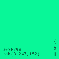 Цвет #08F798 в цветовой модели RGB обозначается тремя октетами (8, 247, 152) в десятичном формате и #08F798 в шестнадцатиричном (hex) формате, которые являются интенсивностью красного 8 (hex 08), интенсивность зелёного 247 (hex F7) и интенсивность синего 152 (hex 98).