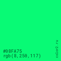 Цвет #08FA75 в цветовой модели RGB обозначается тремя октетами (8, 250, 117) в десятичном формате и #08FA75 в шестнадцатиричном (hex) формате, которые являются интенсивностью красного 8 (hex 08), интенсивность зелёного 250 (hex FA) и интенсивность синего 117 (hex 75).