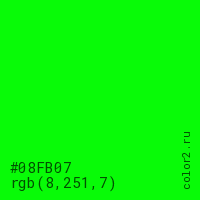 Цвет #08FB07 в цветовой модели RGB обозначается тремя октетами (8, 251, 7) в десятичном формате и #08FB07 в шестнадцатиричном (hex) формате, которые являются интенсивностью красного 8 (hex 08), интенсивность зелёного 251 (hex FB) и интенсивность синего 7 (hex 07).