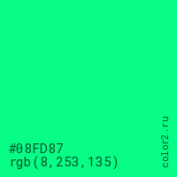 Цвет #08FD87 в цветовой модели RGB обозначается тремя октетами (8, 253, 135) в десятичном формате и #08FD87 в шестнадцатиричном (hex) формате, которые являются интенсивностью красного 8 (hex 08), интенсивность зелёного 253 (hex FD) и интенсивность синего 135 (hex 87).