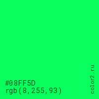 Цвет #08FF5D в цветовой модели RGB обозначается тремя октетами (8, 255, 93) в десятичном формате и #08FF5D в шестнадцатиричном (hex) формате, которые являются интенсивностью красного 8 (hex 08), интенсивность зелёного 255 (hex FF) и интенсивность синего 93 (hex 5D).