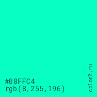 Цвет #08FFC4 в цветовой модели RGB обозначается тремя октетами (8, 255, 196) в десятичном формате и #08FFC4 в шестнадцатиричном (hex) формате, которые являются интенсивностью красного 8 (hex 08), интенсивность зелёного 255 (hex FF) и интенсивность синего 196 (hex C4).