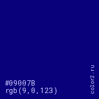 Цвет #09007B в цветовой модели RGB обозначается тремя октетами (9, 0, 123) в десятичном формате и #09007B в шестнадцатиричном (hex) формате, которые являются интенсивностью красного 9 (hex 09), интенсивность зелёного 0 (hex 00) и интенсивность синего 123 (hex 7B).