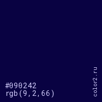 Цвет #090242 в цветовой модели RGB обозначается тремя октетами (9, 2, 66) в десятичном формате и #090242 в шестнадцатиричном (hex) формате, которые являются интенсивностью красного 9 (hex 09), интенсивность зелёного 2 (hex 02) и интенсивность синего 66 (hex 42).