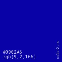 Цвет #0902A6 в цветовой модели RGB обозначается тремя октетами (9, 2, 166) в десятичном формате и #0902A6 в шестнадцатиричном (hex) формате, которые являются интенсивностью красного 9 (hex 09), интенсивность зелёного 2 (hex 02) и интенсивность синего 166 (hex A6).