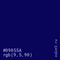 Цвет #09055A в цветовой модели RGB обозначается тремя октетами (9, 5, 90) в десятичном формате и #09055A в шестнадцатиричном (hex) формате, которые являются интенсивностью красного 9 (hex 09), интенсивность зелёного 5 (hex 05) и интенсивность синего 90 (hex 5A).