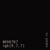 Цвет #090707 в цветовой модели RGB обозначается тремя октетами (9, 7, 7) в десятичном формате и #090707 в шестнадцатиричном (hex) формате, которые являются интенсивностью красного 9 (hex 09), интенсивность зелёного 7 (hex 07) и интенсивность синего 7 (hex 07).