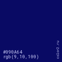 Цвет #090A64 в цветовой модели RGB обозначается тремя октетами (9, 10, 100) в десятичном формате и #090A64 в шестнадцатиричном (hex) формате, которые являются интенсивностью красного 9 (hex 09), интенсивность зелёного 10 (hex 0A) и интенсивность синего 100 (hex 64).