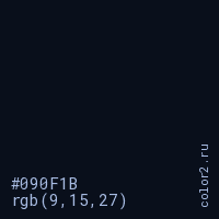 Цвет #090F1B в цветовой модели RGB обозначается тремя октетами (9, 15, 27) в десятичном формате и #090F1B в шестнадцатиричном (hex) формате, которые являются интенсивностью красного 9 (hex 09), интенсивность зелёного 15 (hex 0F) и интенсивность синего 27 (hex 1B).