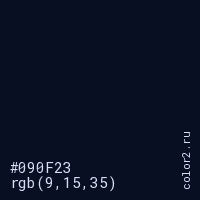 Цвет #090F23 в цветовой модели RGB обозначается тремя октетами (9, 15, 35) в десятичном формате и #090F23 в шестнадцатиричном (hex) формате, которые являются интенсивностью красного 9 (hex 09), интенсивность зелёного 15 (hex 0F) и интенсивность синего 35 (hex 23).
