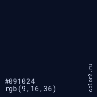 Цвет #091024 в цветовой модели RGB обозначается тремя октетами (9, 16, 36) в десятичном формате и #091024 в шестнадцатиричном (hex) формате, которые являются интенсивностью красного 9 (hex 09), интенсивность зелёного 16 (hex 10) и интенсивность синего 36 (hex 24).