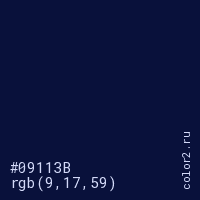 Цвет #09113B в цветовой модели RGB обозначается тремя октетами (9, 17, 59) в десятичном формате и #09113B в шестнадцатиричном (hex) формате, которые являются интенсивностью красного 9 (hex 09), интенсивность зелёного 17 (hex 11) и интенсивность синего 59 (hex 3B).