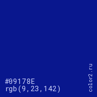 Цвет #09178E в цветовой модели RGB обозначается тремя октетами (9, 23, 142) в десятичном формате и #09178E в шестнадцатиричном (hex) формате, которые являются интенсивностью красного 9 (hex 09), интенсивность зелёного 23 (hex 17) и интенсивность синего 142 (hex 8E).