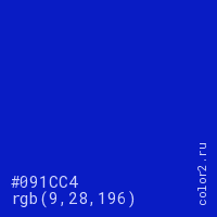 Цвет #091CC4 в цветовой модели RGB обозначается тремя октетами (9, 28, 196) в десятичном формате и #091CC4 в шестнадцатиричном (hex) формате, которые являются интенсивностью красного 9 (hex 09), интенсивность зелёного 28 (hex 1C) и интенсивность синего 196 (hex C4).
