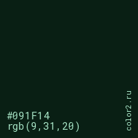 Цвет #091F14 в цветовой модели RGB обозначается тремя октетами (9, 31, 20) в десятичном формате и #091F14 в шестнадцатиричном (hex) формате, которые являются интенсивностью красного 9 (hex 09), интенсивность зелёного 31 (hex 1F) и интенсивность синего 20 (hex 14).