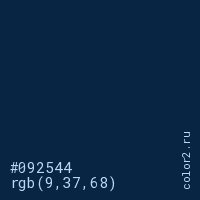 Цвет #092544 в цветовой модели RGB обозначается тремя октетами (9, 37, 68) в десятичном формате и #092544 в шестнадцатиричном (hex) формате, которые являются интенсивностью красного 9 (hex 09), интенсивность зелёного 37 (hex 25) и интенсивность синего 68 (hex 44).
