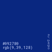 Цвет #092780 в цветовой модели RGB обозначается тремя октетами (9, 39, 128) в десятичном формате и #092780 в шестнадцатиричном (hex) формате, которые являются интенсивностью красного 9 (hex 09), интенсивность зелёного 39 (hex 27) и интенсивность синего 128 (hex 80).