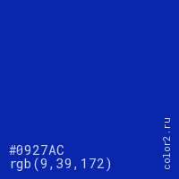 Цвет #0927AC в цветовой модели RGB обозначается тремя октетами (9, 39, 172) в десятичном формате и #0927AC в шестнадцатиричном (hex) формате, которые являются интенсивностью красного 9 (hex 09), интенсивность зелёного 39 (hex 27) и интенсивность синего 172 (hex AC).