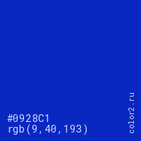 Цвет #0928C1 в цветовой модели RGB обозначается тремя октетами (9, 40, 193) в десятичном формате и #0928C1 в шестнадцатиричном (hex) формате, которые являются интенсивностью красного 9 (hex 09), интенсивность зелёного 40 (hex 28) и интенсивность синего 193 (hex C1).