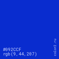Цвет #092CCF в цветовой модели RGB обозначается тремя октетами (9, 44, 207) в десятичном формате и #092CCF в шестнадцатиричном (hex) формате, которые являются интенсивностью красного 9 (hex 09), интенсивность зелёного 44 (hex 2C) и интенсивность синего 207 (hex CF).
