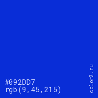 Цвет #092DD7 в цветовой модели RGB обозначается тремя октетами (9, 45, 215) в десятичном формате и #092DD7 в шестнадцатиричном (hex) формате, которые являются интенсивностью красного 9 (hex 09), интенсивность зелёного 45 (hex 2D) и интенсивность синего 215 (hex D7).