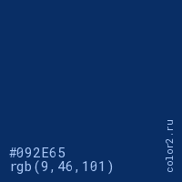 Цвет #092E65 в цветовой модели RGB обозначается тремя октетами (9, 46, 101) в десятичном формате и #092E65 в шестнадцатиричном (hex) формате, которые являются интенсивностью красного 9 (hex 09), интенсивность зелёного 46 (hex 2E) и интенсивность синего 101 (hex 65).