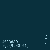 Цвет #09303D в цветовой модели RGB обозначается тремя октетами (9, 48, 61) в десятичном формате и #09303D в шестнадцатиричном (hex) формате, которые являются интенсивностью красного 9 (hex 09), интенсивность зелёного 48 (hex 30) и интенсивность синего 61 (hex 3D).
