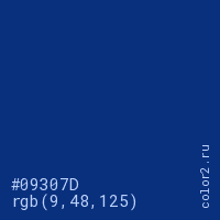 Цвет #09307D в цветовой модели RGB обозначается тремя октетами (9, 48, 125) в десятичном формате и #09307D в шестнадцатиричном (hex) формате, которые являются интенсивностью красного 9 (hex 09), интенсивность зелёного 48 (hex 30) и интенсивность синего 125 (hex 7D).