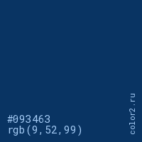 Цвет #093463 в цветовой модели RGB обозначается тремя октетами (9, 52, 99) в десятичном формате и #093463 в шестнадцатиричном (hex) формате, которые являются интенсивностью красного 9 (hex 09), интенсивность зелёного 52 (hex 34) и интенсивность синего 99 (hex 63).