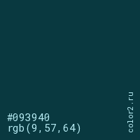 Цвет #093940 в цветовой модели RGB обозначается тремя октетами (9, 57, 64) в десятичном формате и #093940 в шестнадцатиричном (hex) формате, которые являются интенсивностью красного 9 (hex 09), интенсивность зелёного 57 (hex 39) и интенсивность синего 64 (hex 40).