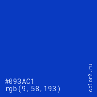 Цвет #093AC1 в цветовой модели RGB обозначается тремя октетами (9, 58, 193) в десятичном формате и #093AC1 в шестнадцатиричном (hex) формате, которые являются интенсивностью красного 9 (hex 09), интенсивность зелёного 58 (hex 3A) и интенсивность синего 193 (hex C1).