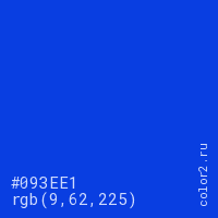Цвет #093EE1 в цветовой модели RGB обозначается тремя октетами (9, 62, 225) в десятичном формате и #093EE1 в шестнадцатиричном (hex) формате, которые являются интенсивностью красного 9 (hex 09), интенсивность зелёного 62 (hex 3E) и интенсивность синего 225 (hex E1).