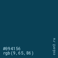 Цвет #094156 в цветовой модели RGB обозначается тремя октетами (9, 65, 86) в десятичном формате и #094156 в шестнадцатиричном (hex) формате, которые являются интенсивностью красного 9 (hex 09), интенсивность зелёного 65 (hex 41) и интенсивность синего 86 (hex 56).