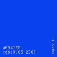 Цвет #0941EE в цветовой модели RGB обозначается тремя октетами (9, 65, 238) в десятичном формате и #0941EE в шестнадцатиричном (hex) формате, которые являются интенсивностью красного 9 (hex 09), интенсивность зелёного 65 (hex 41) и интенсивность синего 238 (hex EE).