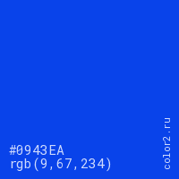 Цвет #0943EA в цветовой модели RGB обозначается тремя октетами (9, 67, 234) в десятичном формате и #0943EA в шестнадцатиричном (hex) формате, которые являются интенсивностью красного 9 (hex 09), интенсивность зелёного 67 (hex 43) и интенсивность синего 234 (hex EA).