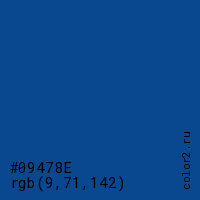 Цвет #09478E в цветовой модели RGB обозначается тремя октетами (9, 71, 142) в десятичном формате и #09478E в шестнадцатиричном (hex) формате, которые являются интенсивностью красного 9 (hex 09), интенсивность зелёного 71 (hex 47) и интенсивность синего 142 (hex 8E).