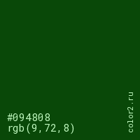 Цвет #094808 в цветовой модели RGB обозначается тремя октетами (9, 72, 8) в десятичном формате и #094808 в шестнадцатиричном (hex) формате, которые являются интенсивностью красного 9 (hex 09), интенсивность зелёного 72 (hex 48) и интенсивность синего 8 (hex 08).